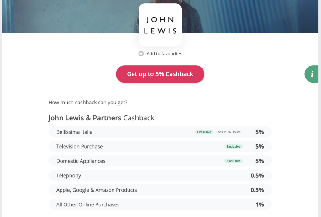 John Lewis : 購入金額の 1% キャッシュバック(デパート)