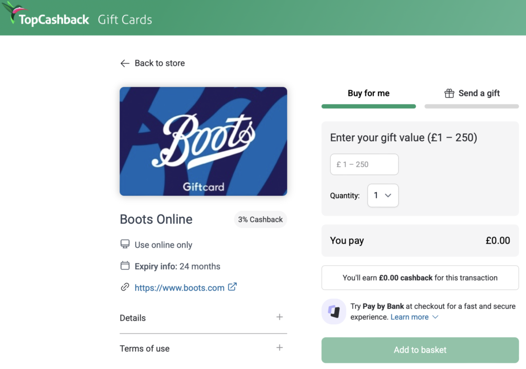 TopGiftCards で £100 分のギフトカードを購入 -> 3% で £3 がキャッシュバックされます。